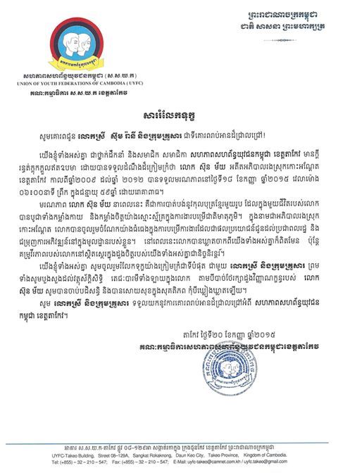 សហភាពសហព័ន្ធយុវជនកម្ពុជា ខេត្តតាកែវ សូមចូលរួមរំលែកទុក្ខយ៉ាងក្រៀមក្រំបំផុត ចំពោះមរណភាព លោក ស៊ុន ម័យ អតីតអភិបាលរងស្រុកកោះអណ្តែត ខេត្តតាកែវ