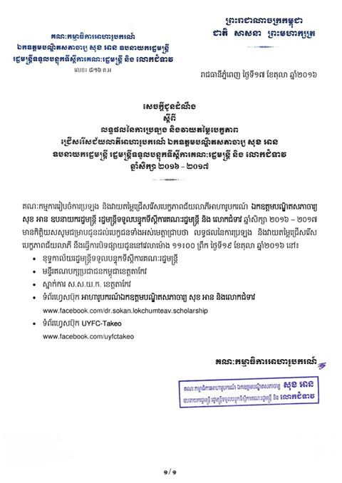 សេចក្តីជូនដំណឹងស្តីអំពី លទ្ធផលនៃការប្រឡង និងវាយតម្លៃបេក្ខភាព ជ្រើសរើសជ័យលាភីអាហារូបករណ៍ ឯកឧត្តមបណ្ឌិតសភាចារ្យ សុខ អាន ឧបនាយករដ្ឋមន្ត្រី រដ្ឋមន្ត្រីទទួលបន្ទុកទីស្តីការគណៈរដ្ឋមន្ត្រី និងលោកជំទាវ ឆ្នាំសិក្សា ២០១៦-២០១៧