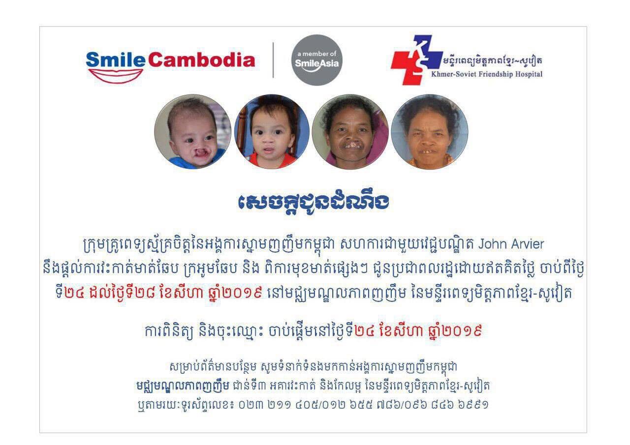 អង្គការស្នាមញញឹមកម្ពុជា សហការជាមួយវេជ្ជបណ្ឌិត John Arvier នឹងផ្តល់ការវះកាត់មាត់ឆែប ក្រអូមឆែប និងពិការមុខមាត់ផ្សេងៗ ដោយឥតគិតថ្លៃជូនប្រជាពលរដ្ឋ ចាប់ពីថ្ងៃទី២៤-២៨ ខែសីហា ឆ្នាំ២០១៨ នៅមជ្ឈមណ្ឌលភាពញញឹម នៃមន្ទីរពេទ្យមិត្តភាពខ្មែរ-សូវៀត។