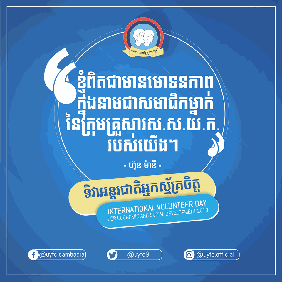 សហភាពសហព័ន្ធយុវជនកម្ពុជា ខ្ញុំសូមឆ្លៀតឱកាសនៃទិវាអន្តរជាតិអ្នកស្ម័គ្រចិត្ត ថ្លែងអំណរគុណយ៉ាងជ្រាលជ្រៅបំផុត ចំពោះសមាជិក សមាជិកាគ្រប់រូប ដែលបានខិតខំប្រឹងប្រែងបំពេញការងារនាពេលកន្លងមក