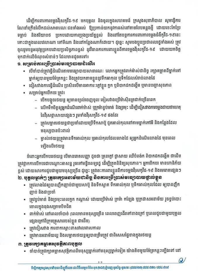 សេចក្ដីណែនាំក្រេីនរំលឹកដល់បងប្អូនប្រជាពលរដ្ឋ ត្រូវបន្តការពារខ្លួនក្នុងអំឡុងពេលឈប់សម្រាកនាសប្តាហ៌ខាងមុខនេះ​ ឱ្យបានត្រឹមត្រូវតាមការណែនាំ