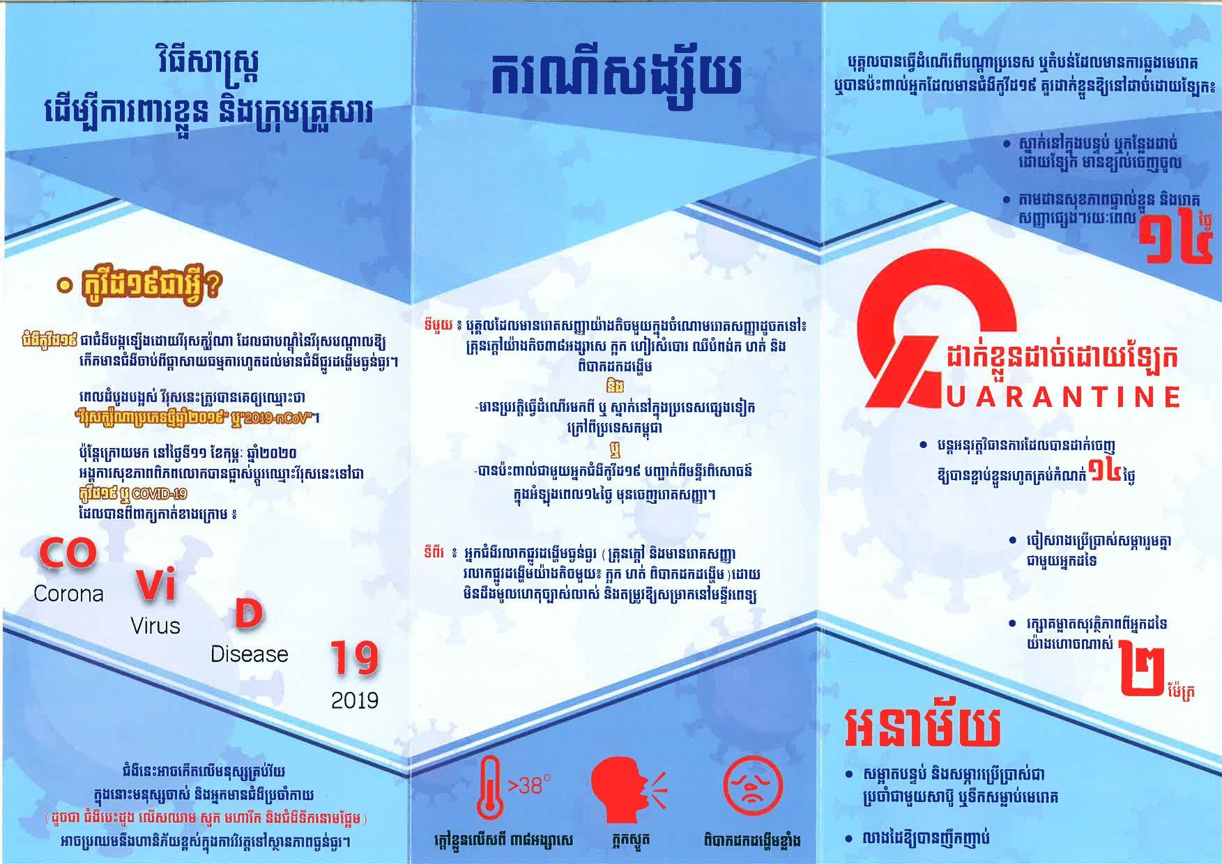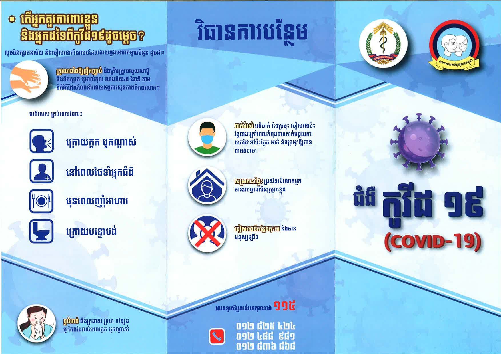 សូមពុកម៉ែបងប្អូន បង្កើនការប្រុងប្រយ័ត្នខ្ពស់ រក្សាអនាម័យឱ្យបានល្អ ដើម្បីទប់ស្កាត់កុំឱ្យមានការឆ្លងរីករាលដាលនៃជំងឺកូវីដ១៩ នៅក្នុងសហគមន៍របស់យើង។ ពាក់ម៉ាសឱ្យបានត្រឹមត្រូវ រក្សាគម្លាតបុគ្គល និងគម្លាតសង្គម (កាត់បន្ថយការជួបជុំ) លាងដៃនឹងសាប៊ូ អាល់កុល ឬជែលសម្លាប់មេរោគឱ្យបានញឹកញាប់ ស្ដាប់និងអនុវត្តតាមការណែនាំនានារបស់ក្រសួងសុខាភិបាល។