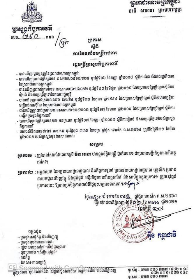 ក្រសួងកិច្ចការនារីប្រកាសតែងតាំង លោកស្រី ម៉ន រតនា ប្រធានផ្នែករដ្ឋបាល និងហិរញ្ញវត្ថុនៃ ស.ស.យ.ក.ខេត្តតាកែវ ជាប្រធានមន្ទីរកិច្ចការនារី ខេត្តតាកែវ
