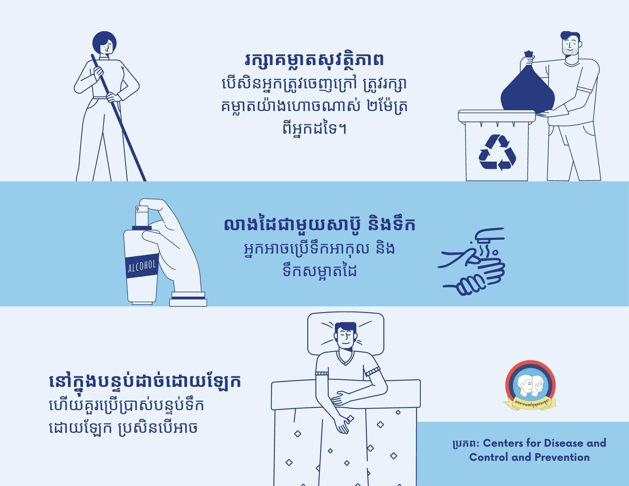 ប្រសិនបើអ្នកជាប់ពាក់ព័ន្ធ ឬមានការសង្ស័យ ថាបានប៉ះពាល់នឹងអ្នកវិជ្ជមានកូវីដ-១៩ សូមធ្វើចត្តាឡីស័ក ឱ្យបានយ៉ាងតិច ១៤ថ្ងៃ។ ការប្រកាន់ខ្ជាប់បែបបទការធ្វើចត្តាឡីស័កបានល្អ គឺជាវិធីមួយដ៏មានប្រសិទ្ធភាព ដើម្បីការពារខ្លួន អ្នកនៅជុំវិញខ្លួនអ្នក និងសហគមន៍ ពីការឆ្លងរីករាលដាលនៃជំងឺកូវីដ-១៩។ សូមកុំមើលស្រាលស្ថានការណ៍! សូមការពារខ្លួនអ្នក ក៏ដូចជាការពារអ្នកជាទីស្រឡាញ់របស់អ្នក! ថ្ងៃចន្ទ ១២រោច ខែជេស្ឋ ឆ្នាំឆ្លូវ ត្រីស័ក ព.ស.២៥៦៥ ត្រូវនឹងថ្ងៃទី៧ ខែមិថុនា ឆ្នាំ២០២១