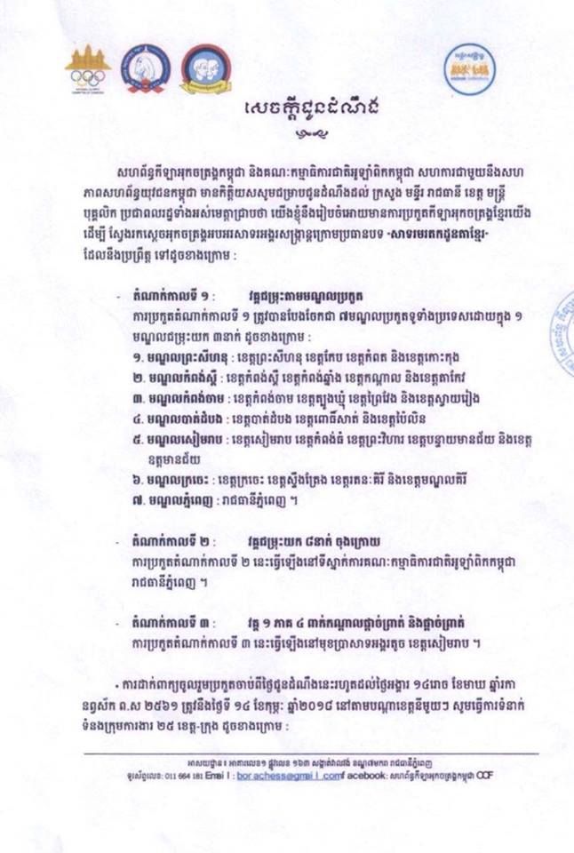 សហព័ន្ធកីឡាអុកចត្រង្គកម្ពុជា និងគណៈកម្មាធិការអូឡាំពិកកម្ពុជា សហការជាមួយនឹងសហភាពសហព័ន្ធយុវជនកម្ពុជា មានកិត្តិយសសូមជម្រាបជូនដំណឹងដល់ ក្រសួង មន្ទីរ រាជធានី ខេត្ត មន្ត្រី បុគ្គលិក ប្រជាពពលរដ្ឋទាំងអស់មេត្តាជ្រាបថា យើងខ្ញុំនឹងរៀបចំអោយមានការប្រកួតកីឡាអុកចត្រង្គខ្មែរយើងដើម្បី ស្វែងរកស្តេចអុកចត្រង្គអបអរសាទរអង្គរសង្ក្រាន្តក្រោមប្រធានបទ «សាទរមរតកដូនតាខ្មែរ»