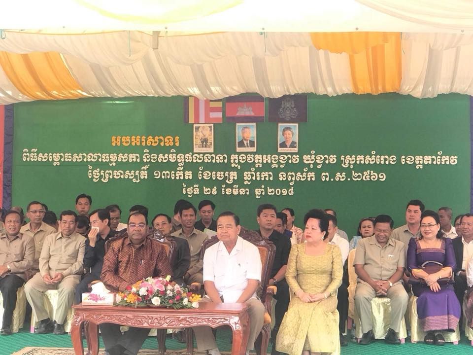 ពិធីសម្ពោធនេះស្ថិតក្រោមអធិបតីភាពរបស់ ឯកឧត្ដមនាយឧត្ដមសេនីយ៍កិត្តិបណ្ឌិត ហ៊ីង ប៊ុនហៀង តំណាងដ៏ខ្ពង់ខ្ពស់សម្ដេចអគ្គមហាសេនាបតីតេជោ ហ៊ុន សែន នាយករដ្ឋមន្ត្រីនៃព្រះរាជាណាចក្រកម្ពុជា និងឯកឧត្ដមបណ្ឌិត ម៉ុក ម៉ារ៉េត តំណាងរាស្រ្តមណ្ឌលតាកែវ និងជាសហប្រធានក្រុមការថ្នាក់កណ្ដាលចុះជួយស្រុកសំរោងទទួលបន្ទុក៣ឃុំ