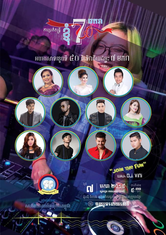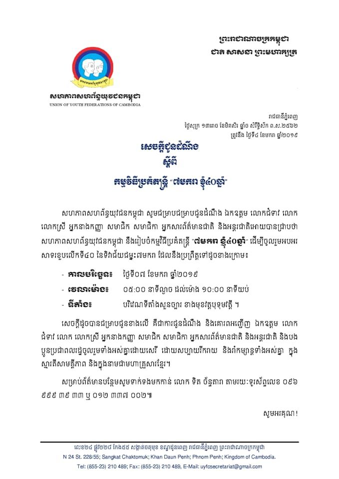 សូមគោរពអញ្ជើញបងប្អូន ពុកម៉ែ មាមីង បងប្រុស បងស្រី សមាជិកា សមាជិកា ប្អូនៗ ក្មួយៗ ចូលរួមរីករាយកំសាន្តជាមួយការប្រគំតន្រ្តី យុវជន "៧មករា ខ្ញុំ៤០ឆ្នាំ" ទាំងអស់គ្នាដោយសេរី ដោយសប្បាយរីករាយ និងរាំកម្សាន្តទាំងអស់គ្នា ក្នុងស្មារតីសាមគ្គីភាព និងក្នុងនាមជាមហាគ្រួសារខ្មែរនា ថ្ងៃទី០៧ ខែមករា ឆ្នាំ២០១៩ វេលាម៉ោង ០៥:០០ នាទីល្ងាច ដល់ម៉ោង ១០:០០ នាទីយប់ នៅបរិវេណទីតាំងសួនច្បារ ខាងមុខវត្តបុទុមវត្តី ។
