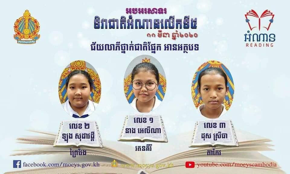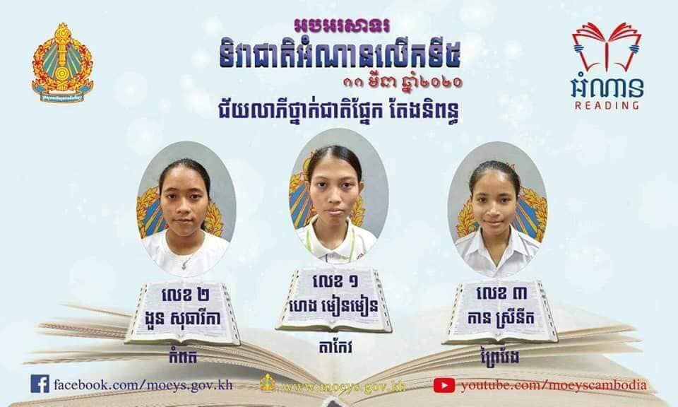 អបអរសាទរយុវសិស្ស ០៣រូបមកពីខេត្តតាកែវ ដែលទទួលបានជ័យលាភី ក្នុងកម្មវិធីប្រកួតប្រជែងអាន ស្មូតកំណាព្យ និងតែងនិពន្ធ "ពានរង្វាន់សម្តេចតេជោ ហ៊ុន សែន" ឆ្នាំ២០២០
