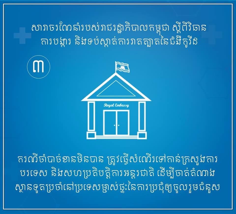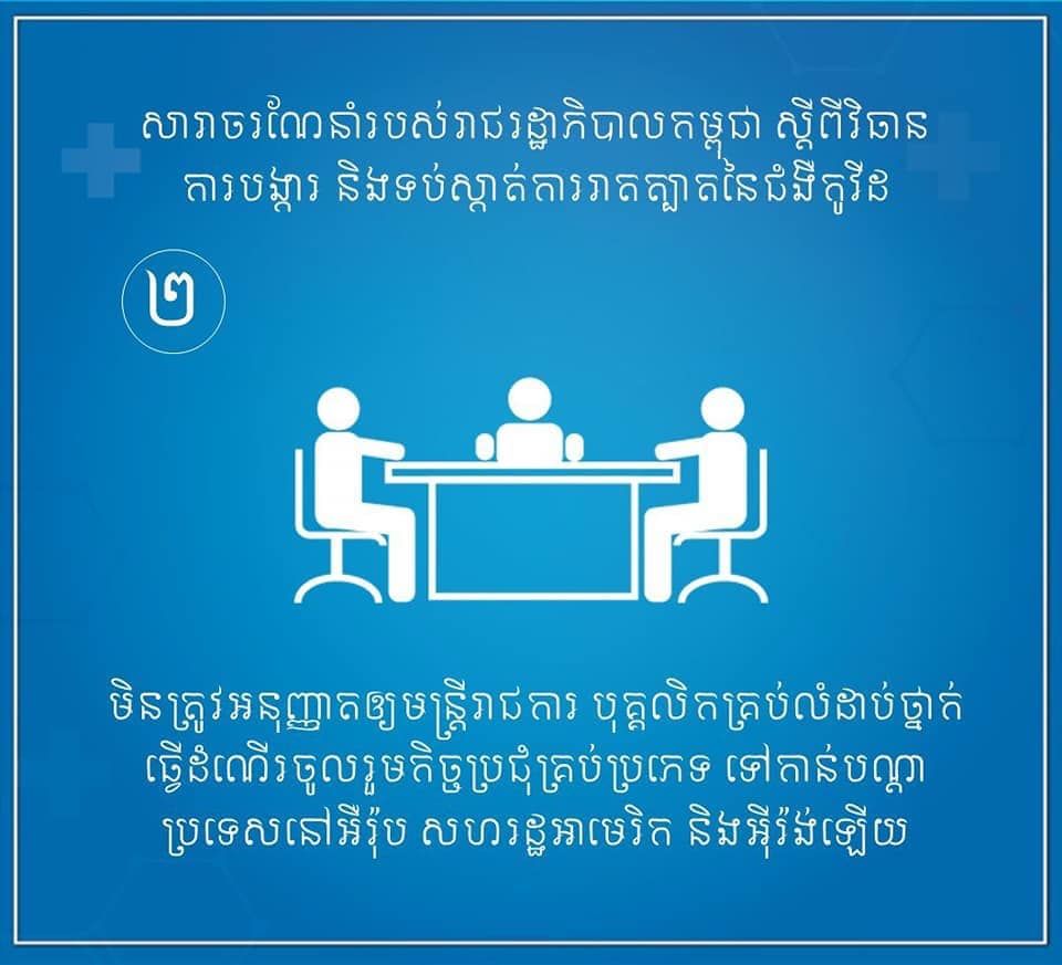 ៤ចំណុចសំខាន់ៗនៃសារាចរណែនាំរបស់រាជរដ្ឋាភិបាលកម្ពុជា ស្ដីពីការបង្ការ និងទប់ស្កាត់ការរាតត្បាតនៃជំងឺកូវីដ ១៩។