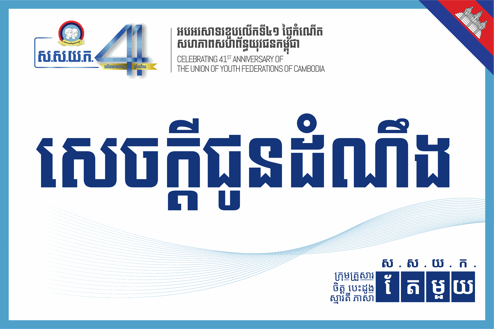 សេចក្ដីជូនដំណឹងដល់អ្នកសារព័ត៌មានស្ដីពី «ពិធីអបអរសាទរខួបលើកទី ៤១ នៃកំណើតសហភាពសហព័ន្ធយុវជនកម្ពុជា ០២ ធ្នូ ១៩៧៨-០២ ធ្នូ ២០១៩» សូមលោក លោកស្រី អ្នកនាង កញ្ញា ជាអ្នកសារព័ត៌មានជាតិ និងអន្តរជាតិ អញ្ជើញចូលរួមយកព័ត៌មាន និងចូលរួមផ្សព្វផ្សាយទៅកាន់សាធារណជនអំពីពិធីនេះ។ សូមទាក់ទងក្រុមការងារតាមរយៈលេខ ០១០ ៣៦២ ៣៩០ សម្រាប់បញ្ជាក់ការចូលរួម។ សូមអរគុណ!