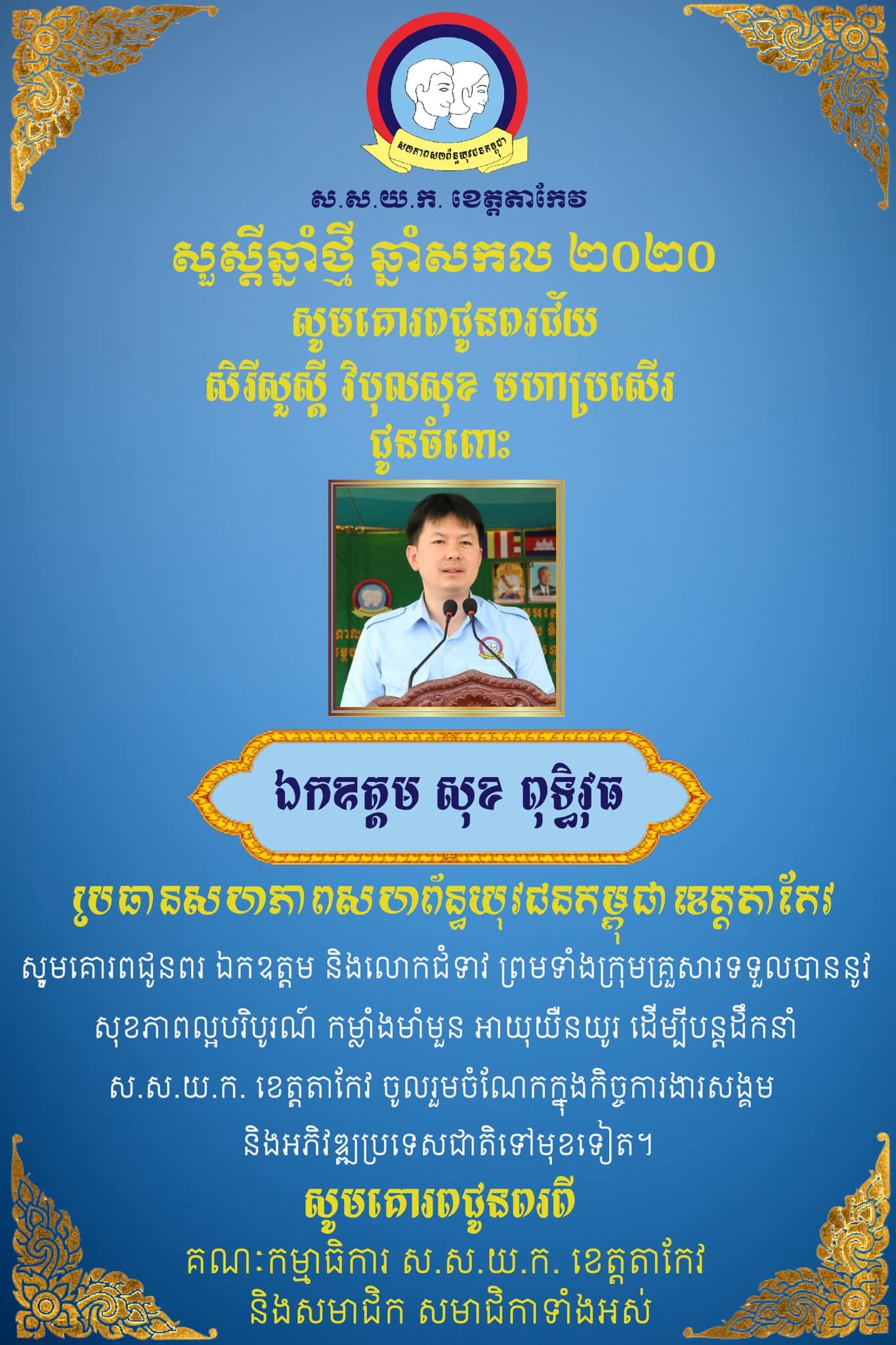 គណៈម្មាធិការស.ស.យ.ក.​ ខេត្តតាកែវ​ និងសមាជិក​ សមាជិកា​ ទាំងអស់សូមគោរពជូនពរឯកឧត្តម​ សុខ​ ពុទ្ធិវុធ​ ប្រធានសហភាពសហព័ន្ធយុវជនម្ពុជា​ខេត្តតាកែវ