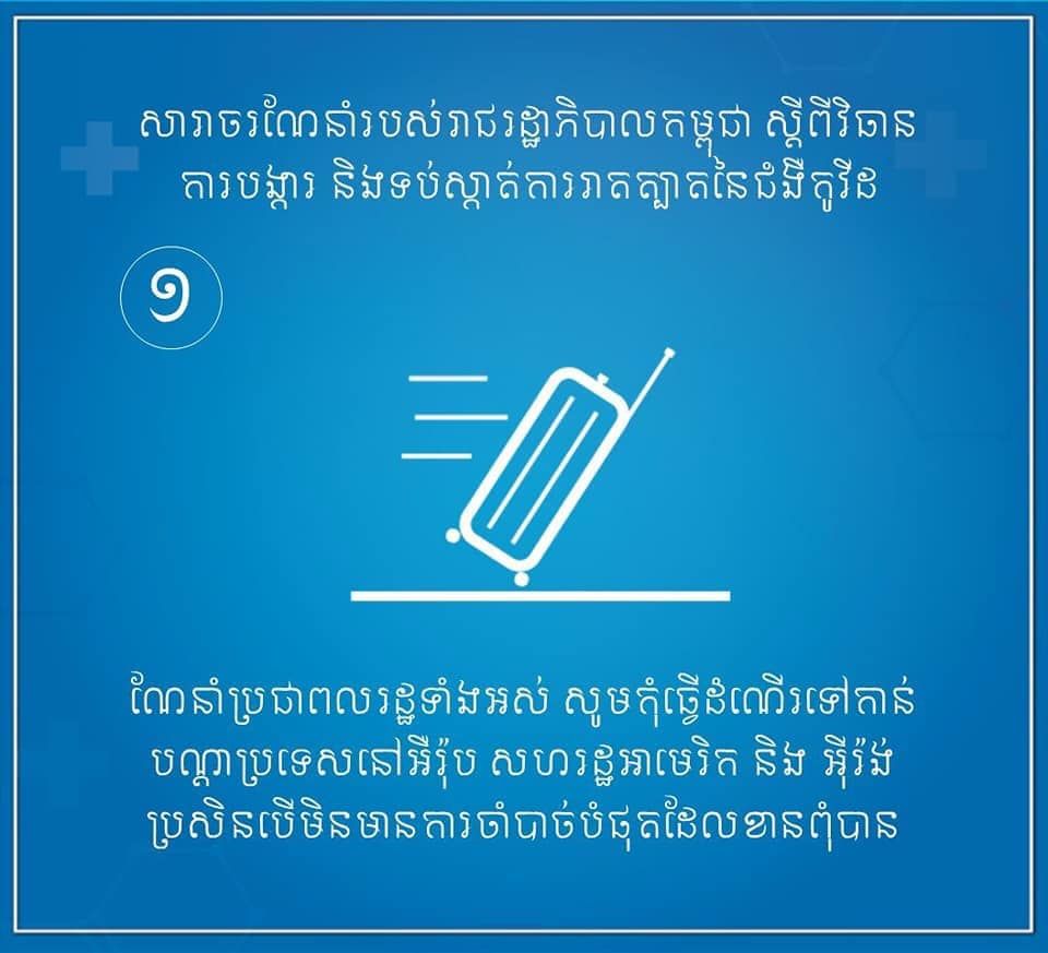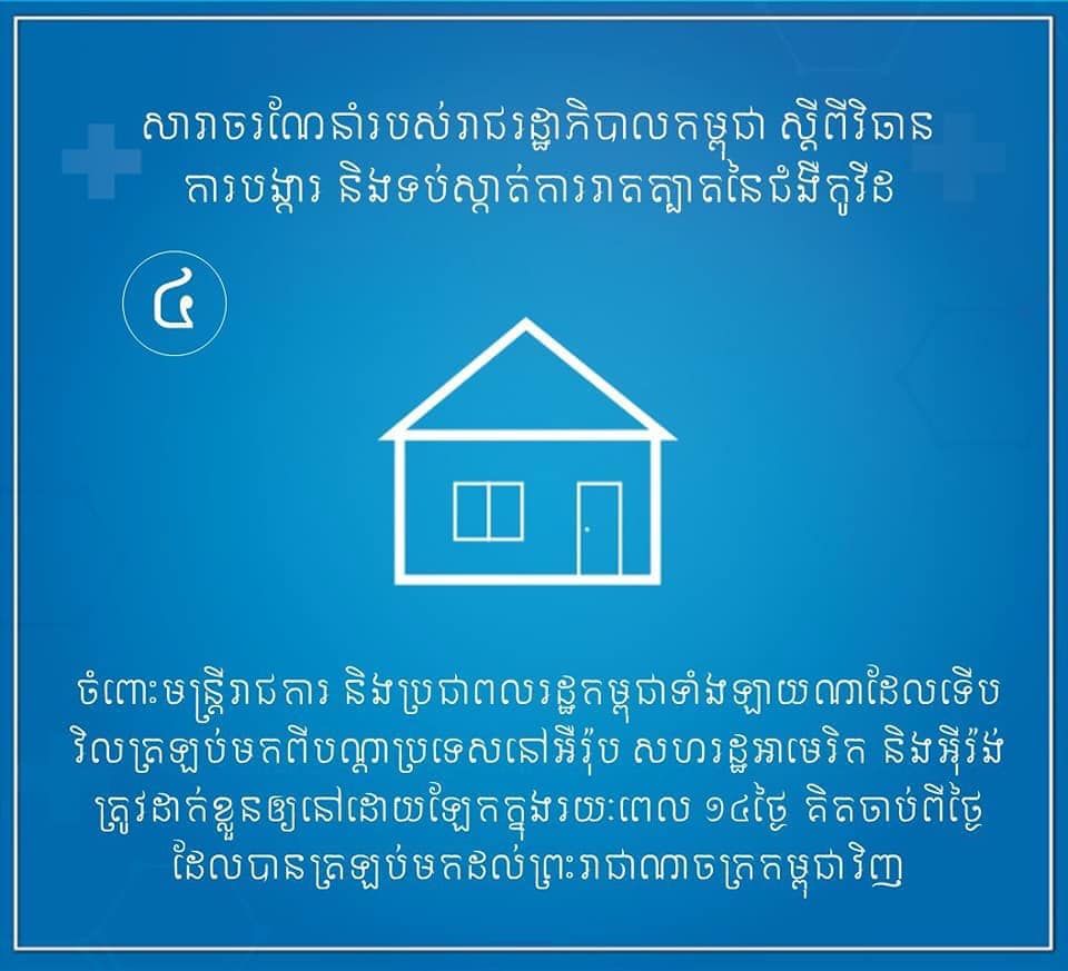 ៤ចំណុចសំខាន់ៗនៃសារាចរណែនាំរបស់រាជរដ្ឋាភិបាលកម្ពុជា ស្ដីពីការបង្ការ និងទប់ស្កាត់ការរាតត្បាតនៃជំងឺកូវីដ ១៩។