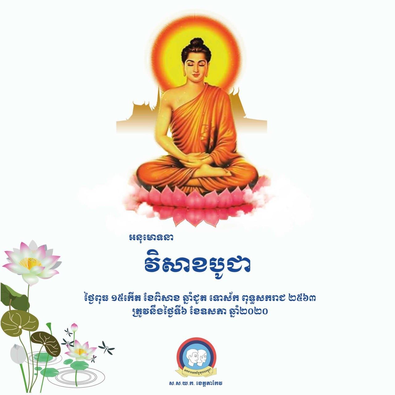 វិសាខបូជាគឺជាពិធីបុណ្យព្រះពុទ្ធសាសនាដ៏មានសារៈសំខាន់ដែលរំឮកដល់ថ្ងៃព្រះពុទ្ធព្រះបរមគ្រូទ្រង់ប្រសូត ទ្រង់ត្រាស់ដឹង និងទ្រង់យាងចូលបរិនិព្វាន។ សូមប្រជាពុទ្ធបរិស័ទអនុមោទនាបុណ្យវិសាខបូជាប្រកបដោយទឹកចិត្តជ្រះថ្លា បរិសុទ្ធ និងសូមទទួលបាននូវពុទ្ធពរទាំងឡាយ៤ប្រកាគឺ អាយុ វណ្ណៈ សុខះ ពលៈ កុំបីមានចន្លោះឡើយ។