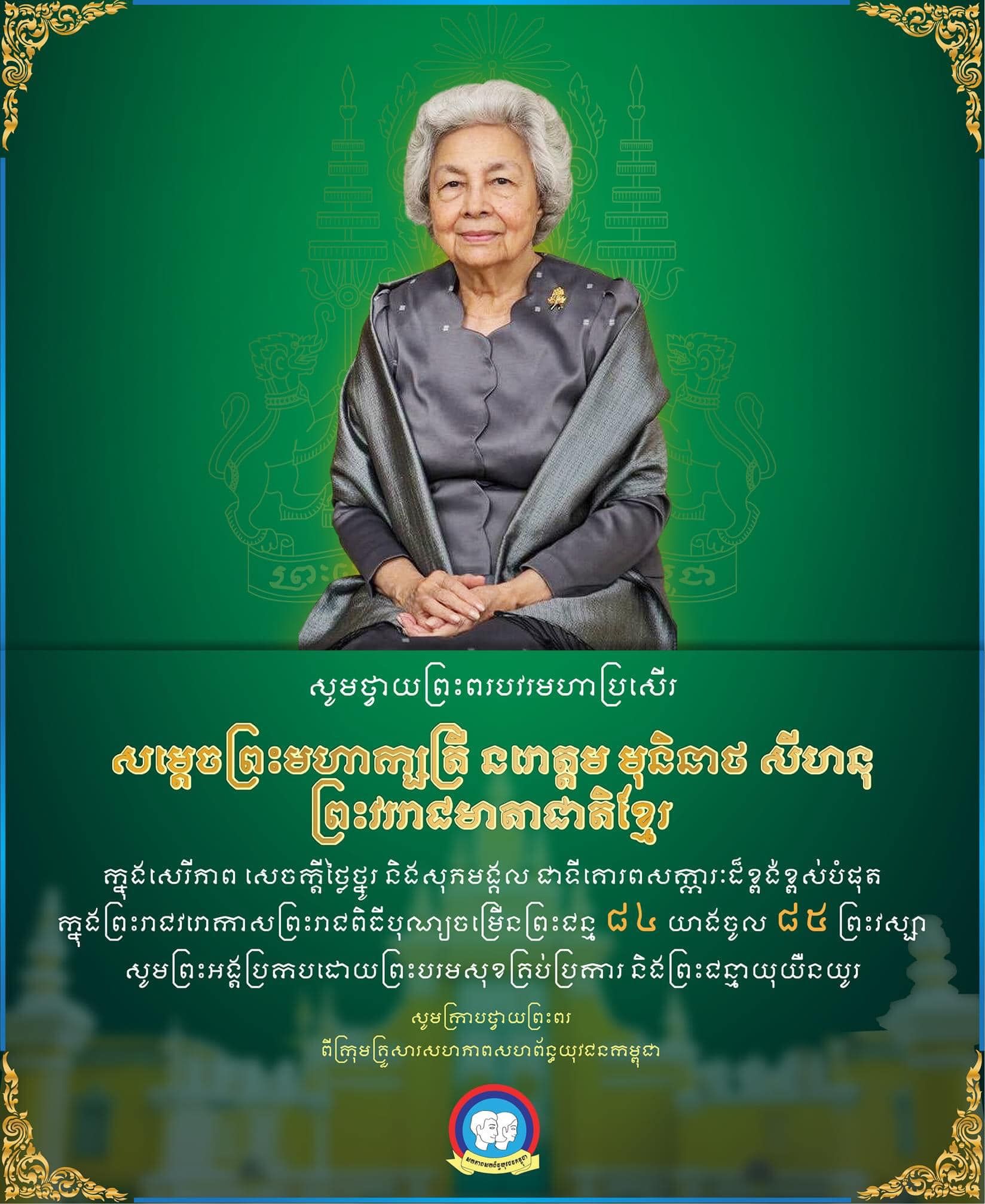 សូមបង្គំអញ្ជលីប្រណម្យបួងសួង ដល់គុណបុណ្យព្រះរតនត្រ័យ អស់វត្ថុស័ក្តិសិទ្ធិក្នុងលោក ទេវតាថែរក្សាព្រះរាជាណាចក្រកម្ពុជា និងទេវតាថែរក្សាព្រះមហាស្វេតឆត្រសូមយាងប្រោះព្រំពរជ័យសិរីបវរមហាប្រសើរថ្វាយ សម្តេចព្រះមហាក្សត្រី នរោត្តម មុនិនាថ សីហនុ ព្រះវររាជមាតាជាតិខ្មែរ ក្នុងសេរីភាព សេចក្តីថ្លៃថ្នូរ និងសុភមង្គល នាវរោកាសដ៏ថ្លៃថ្លានៃព្រះរាជពិធីបុណ្យចម្រើនព្រះជន្មាយុគម្រប់៨៤ យាងចូល៨៥ព្រះវស្សា។ សូមហ្លួងយាយ មានព្រះកាយពលមាំមួន ព្រះជន្មាយុយឺនយូរជាងរយព្រះវស្សាដើម្បីគង់ប្រថាប់ជាម្លប់ដល់កូនចៅ ចៅទួតគ្រប់គ្នា។