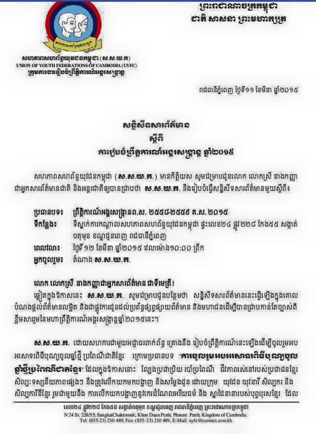 សហភាពសហព័ន្ធយុវជនកម្ពុជា រៀបចំសន្និសីទសារព័ត៌មាន ស្តីពីព្រឹត្តិការអង្គរសង្ក្រាន្តឆ្នាំ២០១៥