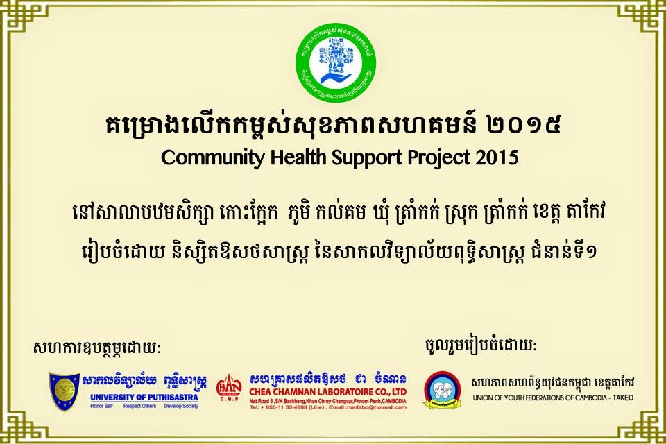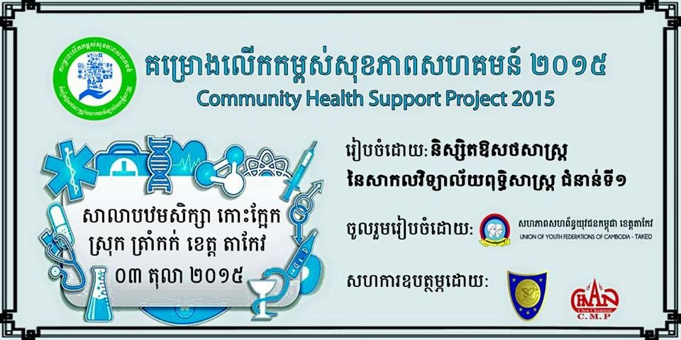 សហភាពសហព័ន្ធយុវជនកម្ពុជា ខេត្តតាកែវ សហការជាមួយនិស្សិតឱសថសាស្ត្រ នៃសាកលវិទ្យាល័យពុទ្ធិសាស្ត្រ ជំនាន់១ នឹងរៀបចំគម្រោងលើកកម្ពស់សុខភាពសហគមន៍ ២០១៥ ដោយធ្វើការពិគ្រោះយោបល់សុខភាព និងចែកជូនថ្នាំពេទ្យ សម្រាប់បងប្អូនប្រជាពលរដ្ឋដោយឥតគិតថ្លៃ នាថ្ងៃទី០៣ ខែតុលា ឆ្នាំ២០១៥ ចាប់ពីម៉ោង០៩៖០០នាទីព្រឹក ដល់ម៉ោង១២៖០០នាទីថ្ងៃត្រង់ នៅសាលាបឋមសិក្សាកោះក្អែក ស្ថិតក្នុងភូមិកល់គម ឃុំត្រាំកក់ ស្រុកត្រាំកក់ ខេត្តតាកែវ។ ដូច្នេះសម្រាប់បងប្អូនដែលមានបញ្ហាសុខភាព សូមអញ្ជើញឱ្យបានគ្រប់ៗគ្នា។