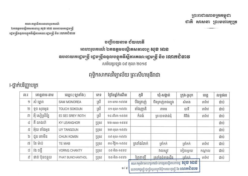 ជ័យលាភីអាហារូបករណ៍ ឯកឧត្តមបណ្ឌិតសភាចារ្យ សុខ អាន ឧបនាយករដ្ឋមន្ត្រី រដ្ឋមន្ត្រីទទួលបន្ទុកទីស្តីការគណៈរដ្ឋមន្ត្រី និងលោកជំទាវ ឆ្នាំ២០១៥ នៅ ពុទ្ធិកសាកលវិទ្យាល័យ ព្រះសីហមុនីរាជា