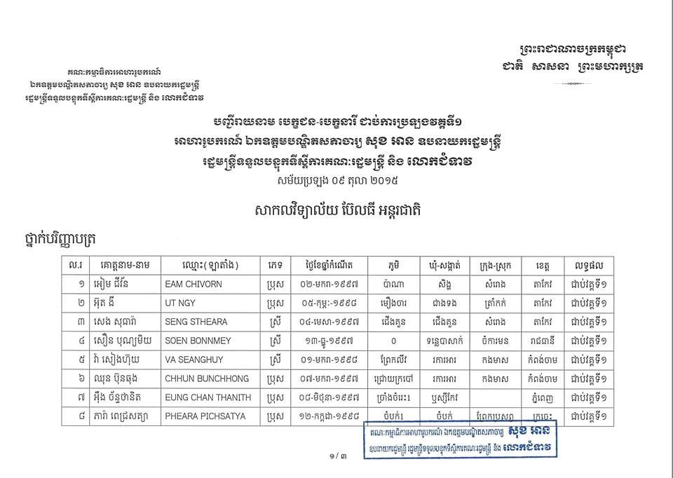 លទ្ធផលប្រឡងជាប់វគ្គទី១ អាហារូបករណ៍ ឯកឧត្តមបណ្ឌិតសភាចារ្យ សុខ អាន និងលោកជំទាវ ឆ្នាំ២០១៥ នៅសាកលវិទ្យាល័យ ប៊ែលធីអន្តរជាតិ