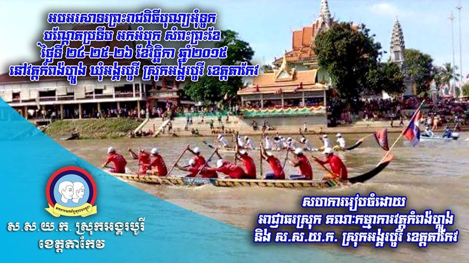 អបអរសាទរព្រះរាជពិធីបុណ្យអុំទូក បណ្តែតប្រទីប អកអំបុក សំពះព្រះខែ ថ្ងៃទី ២៤-២៥-២៦ ខែវិច្ឆិកា ឆ្នាំ២០១៥ នៅវត្តកំពង់ហ្លួង ស្ថិតនៅឃុំអង្គរបូរី ស្រុកអង្គរបូរី ខេត្តតាកែវ ដោយមានការចូលរួមសហការរៀបចំដោយ៖ អាជ្ញាធរស្រុក