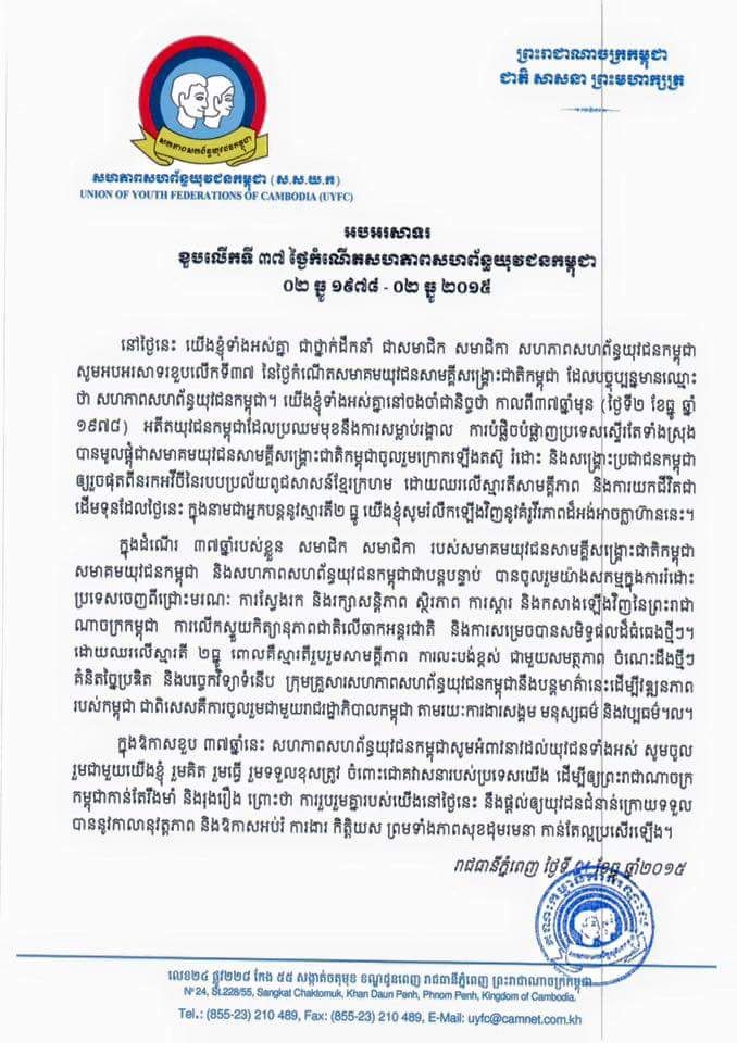 អបអរសាទរ ខួបលើកទី៣៧ ថ្ងៃកំណើតសហភាពសហព័ន្ធយុវជនកម្ពុជា (២ ធ្នូ ១៩៧៨ - ២ ធ្នូ ២០១៥)
