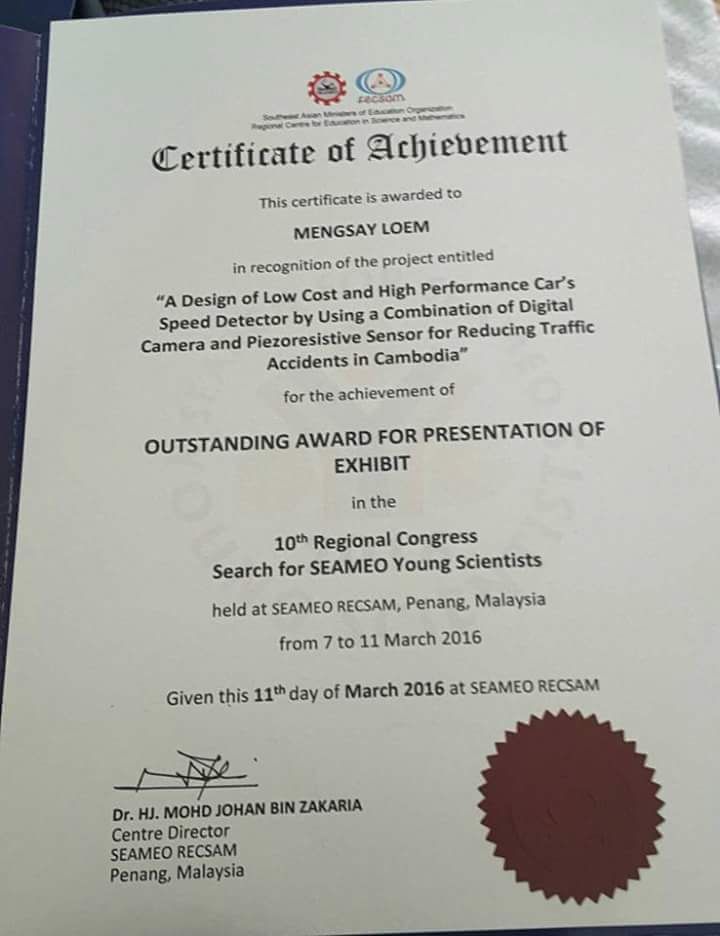 សូមអបអរសាទរចំពោះយុវសិស្ស លឹម ម៉េងសាយ អតីតសិស្សវិទ្យាល័យ សម្តេចអគ្គមហាសេនាបតីតេជោ ហ៊ុន សែន អង្គតាសោម ស្ថិតក្នុងស្រុកត្រាំកក់ ខេត្តតាកែវ ដែលទទួលបានពានរង្វាន់ល្អប្រសើរបំផុត Outstanding Award ក្នុងការប្រកួតជ្រើសរើសអ្នកវិទ្យាសាស្ត្រវ័យក្មេងស៊ីមេអូ លើកទី១០ "10th SSYS: Search For SEAMEO Young Scientists" នៅទីក្រុងប៉េណាំង ប្រទេសម៉ាឡេស៊ី ដែលប្រព្រឹត្តទៅកាលពីថ្ងៃទី៧ ដល់ថ្ងៃទី១១ ខែមីនា ឆ្នាំ២០១៦