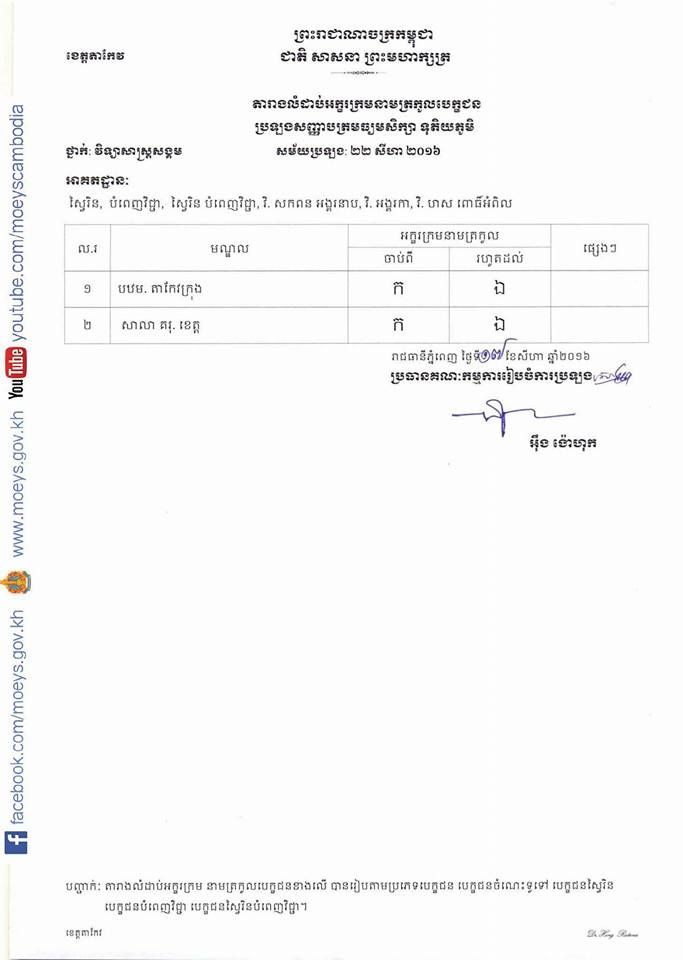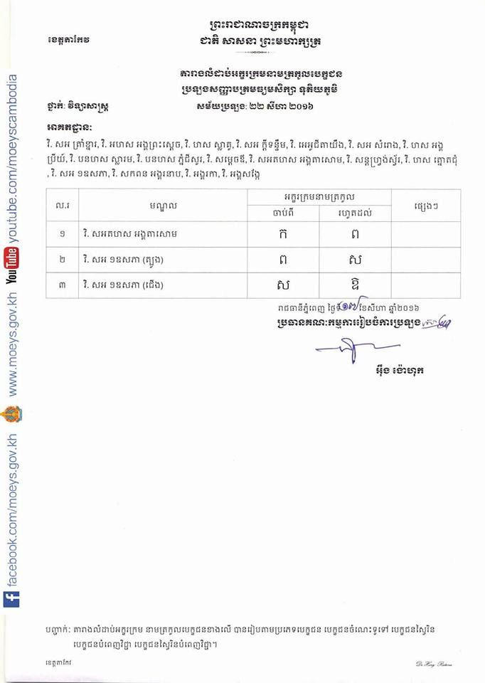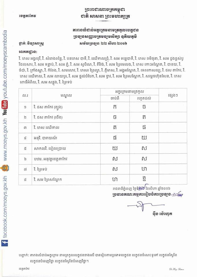 តារាងលំដាប់អក្សរក្រមនាមត្រកូលបេក្ខជនប្រឡងសញ្ញាបត្រមធ្យមសិក្សា ទុតិយភូមិ សម័យប្រឡង ២២ សីហា ២០១៦ ទាំង ១៣មណ្ឌល ក្នុងខេត្តតាកែវ។