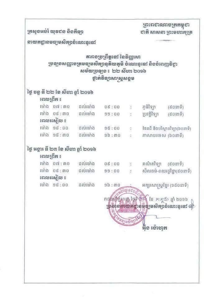 កាលវិភាគប្រឡងមធ្យមសិក្សាទុតិយភូមិ ២២ សីហា ២០១៦សូមជូនពរបេក្ខជនទាំងអស់ សូមជោគជ័យក្នុងការប្រឡង និងធ្វើដំណើរប្រកបដោយសុវត្ថិភាព!