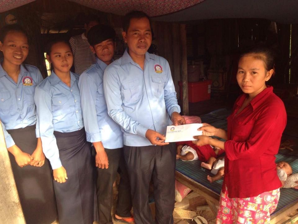 សមាជិក ស.ស.យ.ក. ខេត្តតាកែវ បានទៅចុះសួរសុខទុក្ខ ព្រមទាំងបាននាំយកនូវថវិកាចំនួន ១០០.០០០៛ (មួយរយពាន់រៀល) ជូនដល់ បងប្រុស ឡេង វណ្ណឌី ប្រពន្ធឈ្មោះ អាន បុប្ផា ដែលសម្រាលបានកូនភ្លោះប្រុសបី
