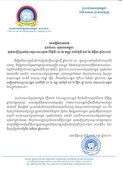 សេចក្តីអំពាវនាវរបស់សហភាពសហព័ន្ធយុវជនកម្ពុជា ជូនចំពោះយុវជនកម្ពុជាសូមអញ្ជើញទៅចុះឈ្មោះបោះឆ្នោត ពីថ្ងៃទី០១ ខែកញ្ញា ដល់ថ្ងៃទី២៩ ខែវិច្ឆិកា ឆ្នាំ២០១៦ចុះឈ្មោះបោះឆ្នោត យុវជនកម្ពុជា
