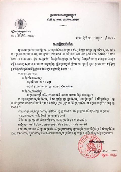 ដាក់ពាក្យចូលរួមប្រកួតនៅមន្ទីរវប្បធម៌ និងវិចិត្រសិល្បៈខេត្ត ឬតាមមន្ទីរអប់រំ យុវជន និងកីឡា ក្រុង ស្រុក ចាប់ពីថ្ងៃជូនដំណឹងនេះរហូតដល់ថ្ងៃទី២០ ខែធ្នូ ឆ្នាំ២០១៦។
