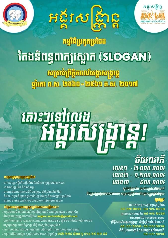 អាស្រ័យហេតុនេះសូមសាធារណជន និងយុវជនទូទៅ ដែលមានចំណាប់អារម្មណ៍ សូមដាក់ពាក្យចូលរួមកម្មវិធីប្រកួតប្រជែងនេះឱ្យបានច្រើនកុះករ។ សូមស្វែងរកព័ត៌មានលម្អិតអំពីលក្ខខណ្ឌ និងកាលបរិច្ឆេទនៃកម្មវិធីប្រកួតនៅលើខិតប័ណ្ណផ្សព្វផ្សាយ ឬអាចទំនាក់ទំនងមកកាន់អ៊ីម៉ែល angkor.sankranta@gmail.com ឬលេខទូរស័ព្ទ ០៩២ ២២៤ ៥៣៧/ ០១៥ ២៩៣ ៣៩៩។ សូមជូនពរសំណាងល្អ!