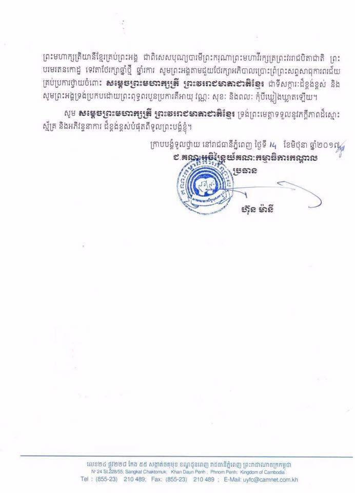 តាងនាមថ្នាក់ដឹកនាំ និងសមាជិកក្រុមគ្រួសារសហភាពសហព័ន្ធយុវជនកម្ពុជា សូមបរមរាជានុញ្ញាត លំឱនកាយក្រាបបង្គំសម្តែងថ្វាយនូវព្រះសព្ទសាធុការពរជ័យបវរសួស្តី វិបុលសុខ មហាប្រសើរគ្រប់យ៉ាងចំពោះសម្តេចព្រះមហាក្សត្រី នរោត្តម មុនិនាថ សីហនុ ព្រះវររាជមាតាជាតិខ្មែរជាទីសក្ការៈដ៏ខ្ពង់ខ្ពស់ សូមទ្រង់ព្រះអង្គប្រកបដោយព្រះរាជសុខភាពល្អបរិបូណ៍ ព្រះកាយពលរឹងមាំ ព្រះបញ្ញាញាណភ្លឺថ្លាត្រចះត្រចង់ ព្រះជន្មាយុយឿនយូរ ក្នុងឱកាសដ៏មហានក្ខត្តឫក្សប្រពៃថ្លៃថ្លានៃព្រះរាជពិធីបុណ្យចម្រើនព្រះជន្មគម្រប់៨១ព្រះវស្សា យាងចូល៨២ព្រះវស្សា នៅថ្ងៃទី១៨ ខែមិថុនា ឆ្នាំ២០១៧នេះ។