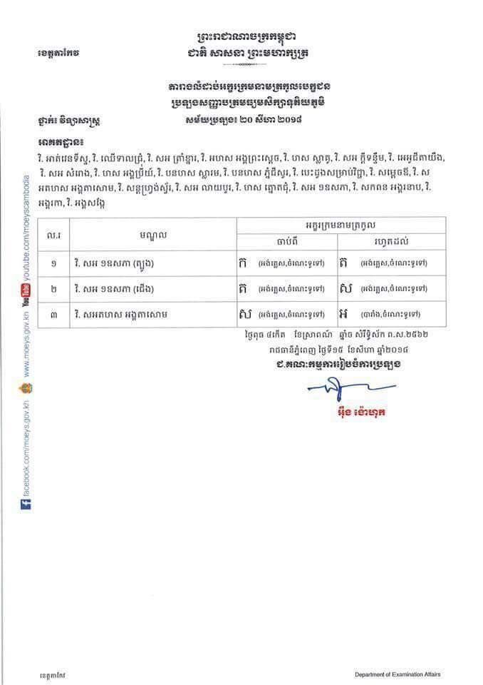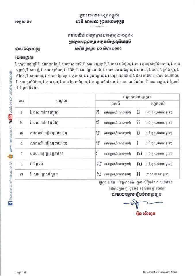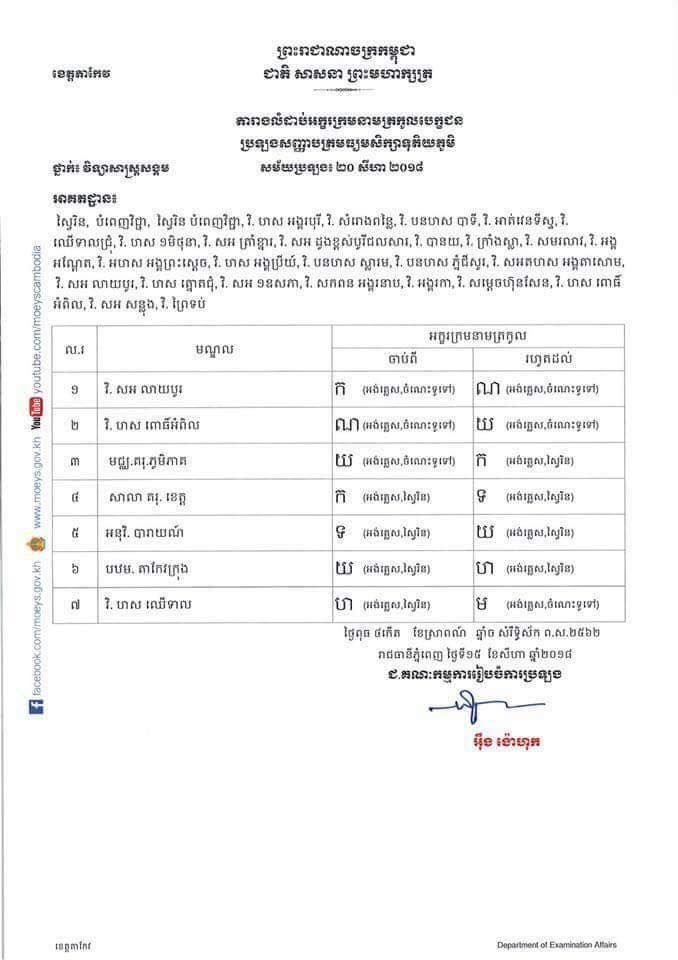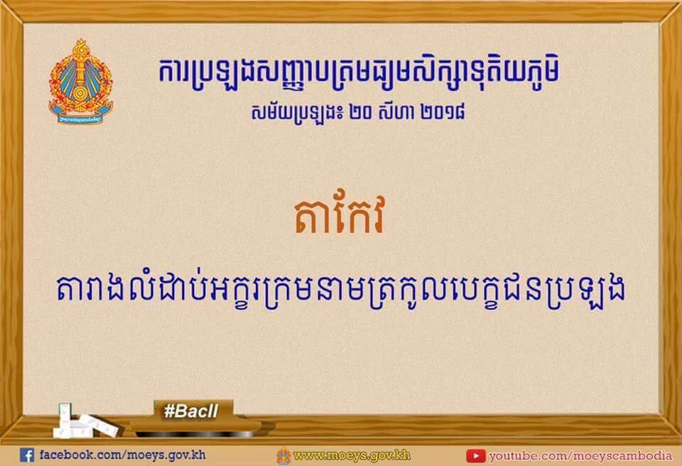 ជួយស៊ែរដើម្បីអោយបេក្ខជនខេត្តយើងបានដឹង តារាងលំដាប់អក្ខរក្រមនាមត្រកូលបេក្ខជន ប្រឡងសញ្ញាបត្រមធ្យមសិក្សាទុតិយភូមិ សម័យប្រឡង៖ ២០ សីហា ២០១៨។
