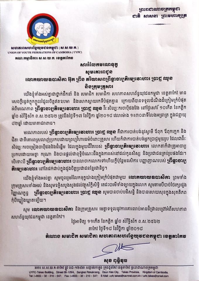 ឯកឧត្តម សុខ ពុទ្ធិវុធ រដ្ឋលេខាធិការក្រសួងប្រៃសណីយ៍និងទូរគមនាគមន៍ និងជាប្រធានសហភាពសហព័ន្ធយុវជនកម្ពុជា ខេត្តតាកែវ បានដឹកនាំប្រតិភូសហភាពសហព័ន្ធយុវជនកម្ពុជា ខេត្តតាកែវ ចូលរួមរំលែកទុក្ខចំពោះក្រុមគ្រួសារសព និងគោរពវិញ្ញាណក្ខន្ធព្រឹទ្ធាចារ្យភិរម្យវោហារ ប្រាជ្ញ ឈួន វីរ:សិល្ប:ចាប៉ីដងវែងដ៏ល្បីល្បាញ ដែលបានទទួលមរណភាពនៅថ្ងៃសៅរ៍ ១០កើត ខែកត្តិក ឆ្នាំច សំរឹទ្ធិស័ក ព.ស.២៥៦២ ត្រូវនឹងថ្ងៃទី១៧ ខែវិច្ឆិកា ឆ្នាំ២០១៨ វេលាម៉ោង ១៖៣០នាទី រំលងអធ្រាត្រ ក្នុងជន្មាយុ ៨២ឆ្នាំ ដោយរោគាជរាពាធ។