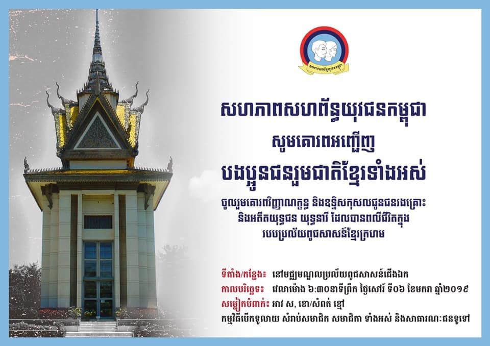 សូមគោរពអញ្ជេីញ សមាជិក សមាជិកាបងប្អូនប្រជាពលរដ្ឋខ្មែរទាំងអស់ចូលរួម គោរពវិញ្ញាណក្ខន្ធ ឧទ្ទិសកុសល និងរំឮកដល់គម្រូវីរភាពនៃការពលីរបស់យុទ្ធជន យុទ្ធនារី ក្នុងបុព្វហេតុជាតិមាតុភូមិ