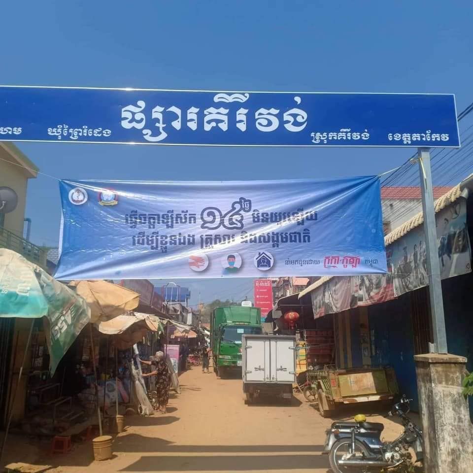 ដើម្បីចូលរួមជាមួយក្រសួងសុខាភិបាល និងរាជរដ្ឋាភិបាលក្នុងការប្រយុទ្ធប្រឆាំងជំងឺCOVID-19 គណៈកម្មាធិការ ស.ស.ស.យ.ក.ស្រុកគីរីវង់ បានចុះចងបដានិងផ្សព្វផ្សាយអប់រំការទប់ស្កាត់ ការពារការឆ្លងរីករាលដាលជំងឺCOVID-19 នៅក្នុងសហគមន៍ ស្ថិតនៅផ្សារគីរីវង់ ស្រុកគីរីវង់ ខេត្តតាកែវ ដោយមានការអញ្ជើញចូលរួមពីលោកអភិបាលរងស្រុក លោកគ្រូពេទ្យ សមាជិកក្រុមប្រឹក្សាឃុំ ប៉ុស្តិ៍នគរបាលរដ្ឋបាលឃុំ និងលោកមេភូមិ។ ថ្ងៃ សុក្រ ៦កើត ខែចេត្រ ឆ្នាំជូត ទោស័ក ព.ស.២៥៦៤ ត្រូវនឹងថ្ងៃទី១៩ ខែមីនា ឆ្នាំ២០២១