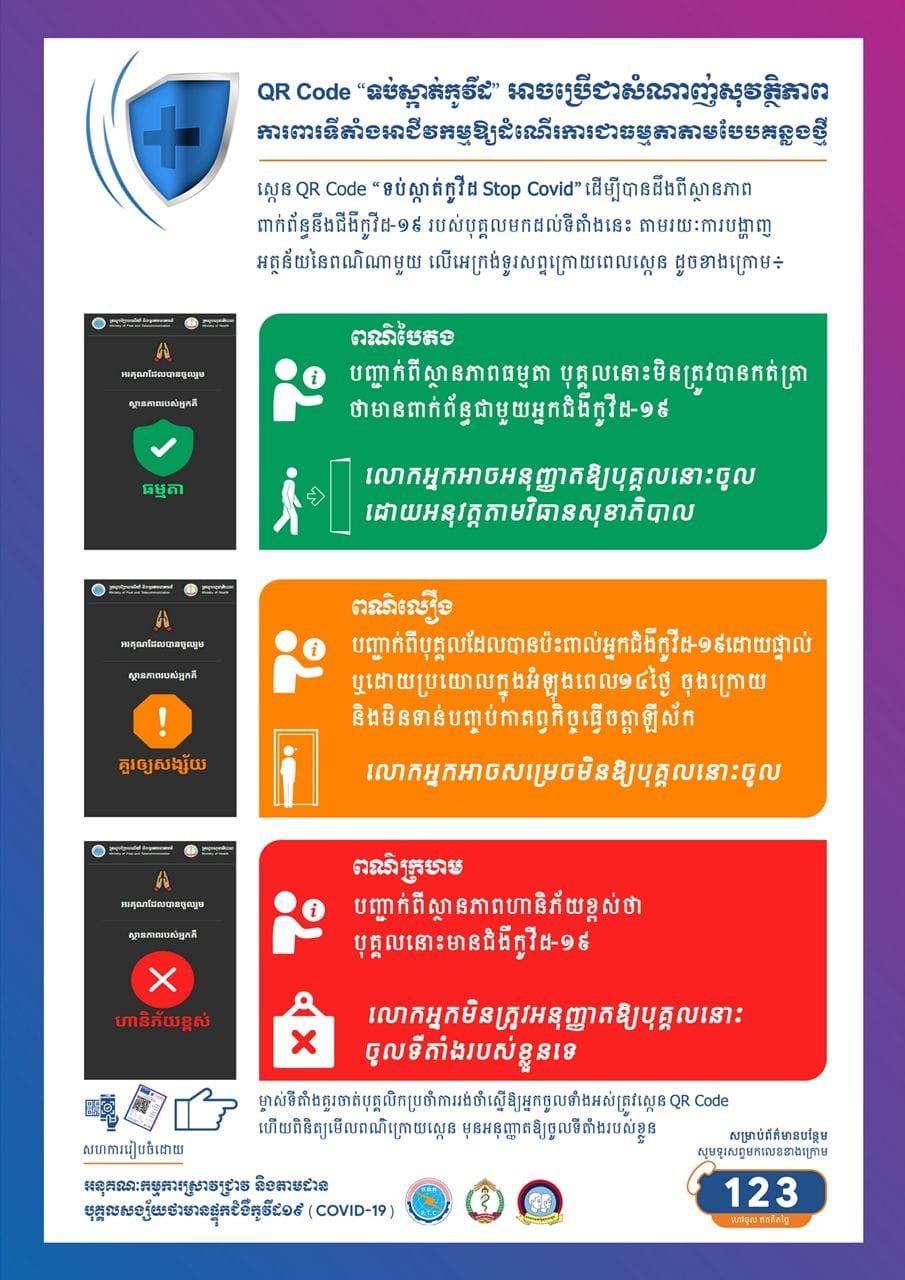 ដើម្បីចូលរួមប្រយុទ្ធប្រឆាំង ទប់ស្កាត់ការឆ្លងរីករាលដាលនៃជម្ងឺCovid-19 ជាមួយរាជរដ្ឋាភិបាលកម្ពុជា សូមបងប្អូនប្រជាពលរដ្ឋទាំងអស់ ស្វែងយល់ពីរបៀបនៃការស្កេន QR Code " ទប់ស្កាត់កូវីដ " អាចប្រើជាសំណាញ់សុវត្ថិភាពការពារទីតាំងអាជីវកម្មឱ្យដំណើរការជាធម្មតាតាមបែបគន្លងថ្មី។