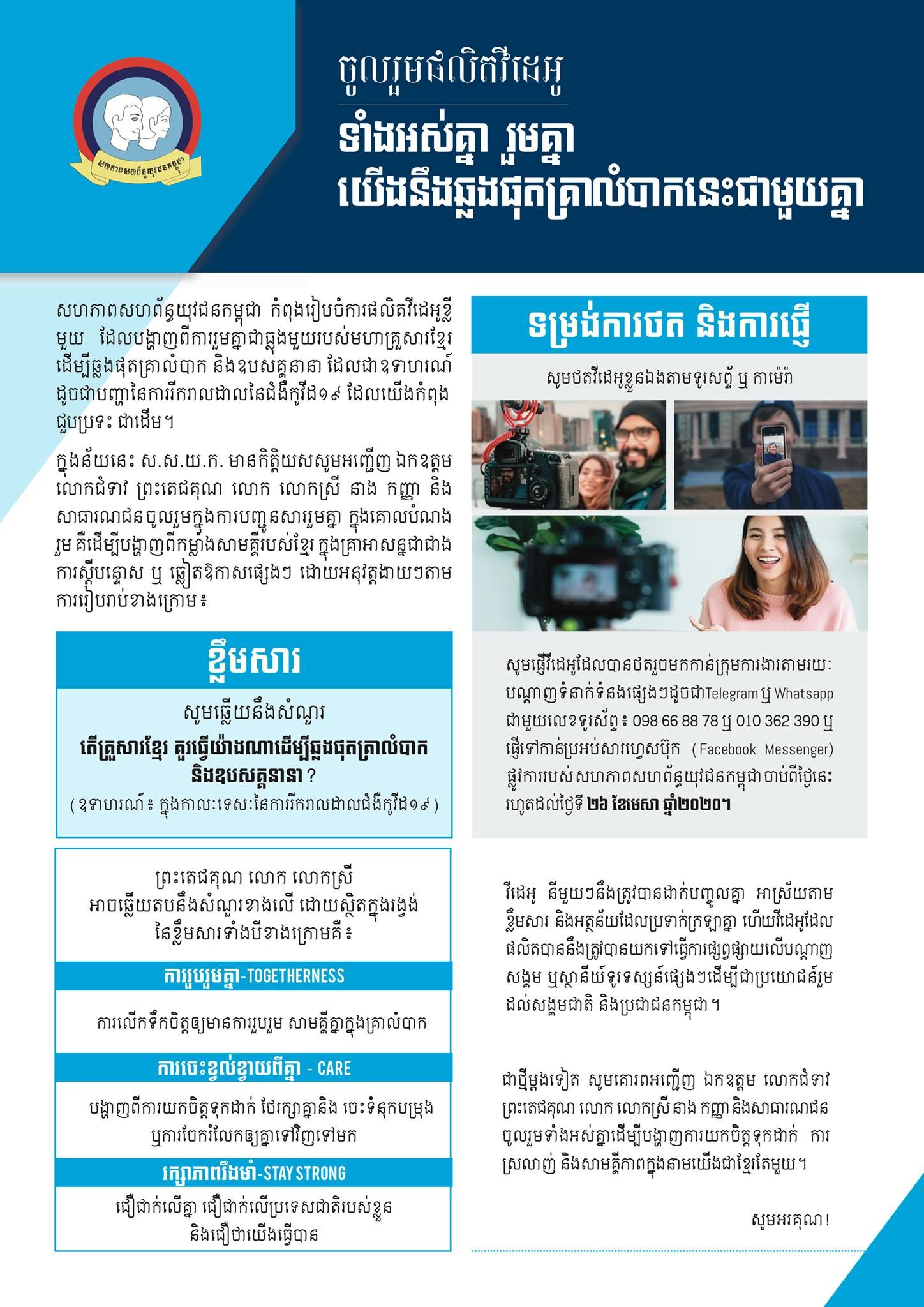 សហភាពសហព័ន្ធយុវជនកម្ពុជា កំពុងរៀបចំការផលិតវីដេអូខ្លីមួយដែលបង្ហាញពីការរួមគ្នាជាធ្លុងមួយរបស់មហាគ្រួសារខ្មែរដើម្បីឆ្លងផុតគ្រាលំបាក និងឧបសគ្គនានាដែលជាឧទាហរណ៍ ដូចជាបញ្ហានៃការរីករាលដាលនៃជំងឺកូវីដ១៩ ដែលយើងកំពុងជួបប្រទះជាដើម។ ក្នុងន័យនេះស.ស.យ.ក.មានកិត្តិយសសូមអញ្ជើញ ឯកឧត្តម លោកជំទាវ ព្រះតេជគុណ លោក លោកស្រី នាងកញ្ញា និងសាធារណជនចូលរួមក្នុងការបញ្ជូនសាររួមគ្នា ក្នុងគោលបំណងរួមគឺដើម្បីបង្ហាញពីកម្លាំងសាមគ្គីរបស់ខ្មែរក្នុងគ្រាអាសន្នជាជាងការស្តីបន្ទោស ឬឆ្លៀតឱកាសផ្សេងៗ។
