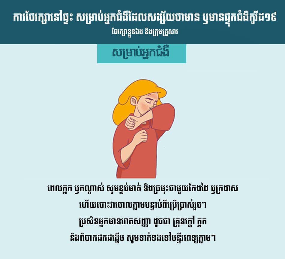 ប្រសិនអ្នកកំពុងតែមានរោគសញ្ញាណដូចជា គ្រុនក្តៅ ក្អក ឫពិបាកដកដង្ហើម ហើយសង្ស័យថាខ្លួនឯងអាចមានផ្ទុកជំងឺកូវីដ១៩ ឫកំពុងតែផ្ទុកជំងឺកូវីដ១៩ សូមធ្វើតាមវិធានការណ៍ខាងក្រោមនេះដើម្បីការពារខ្លួនអ្នកផ្ទាល់ និងសមាជិកគ្រួសារពីការឆ្លងជំងឺនេះ។